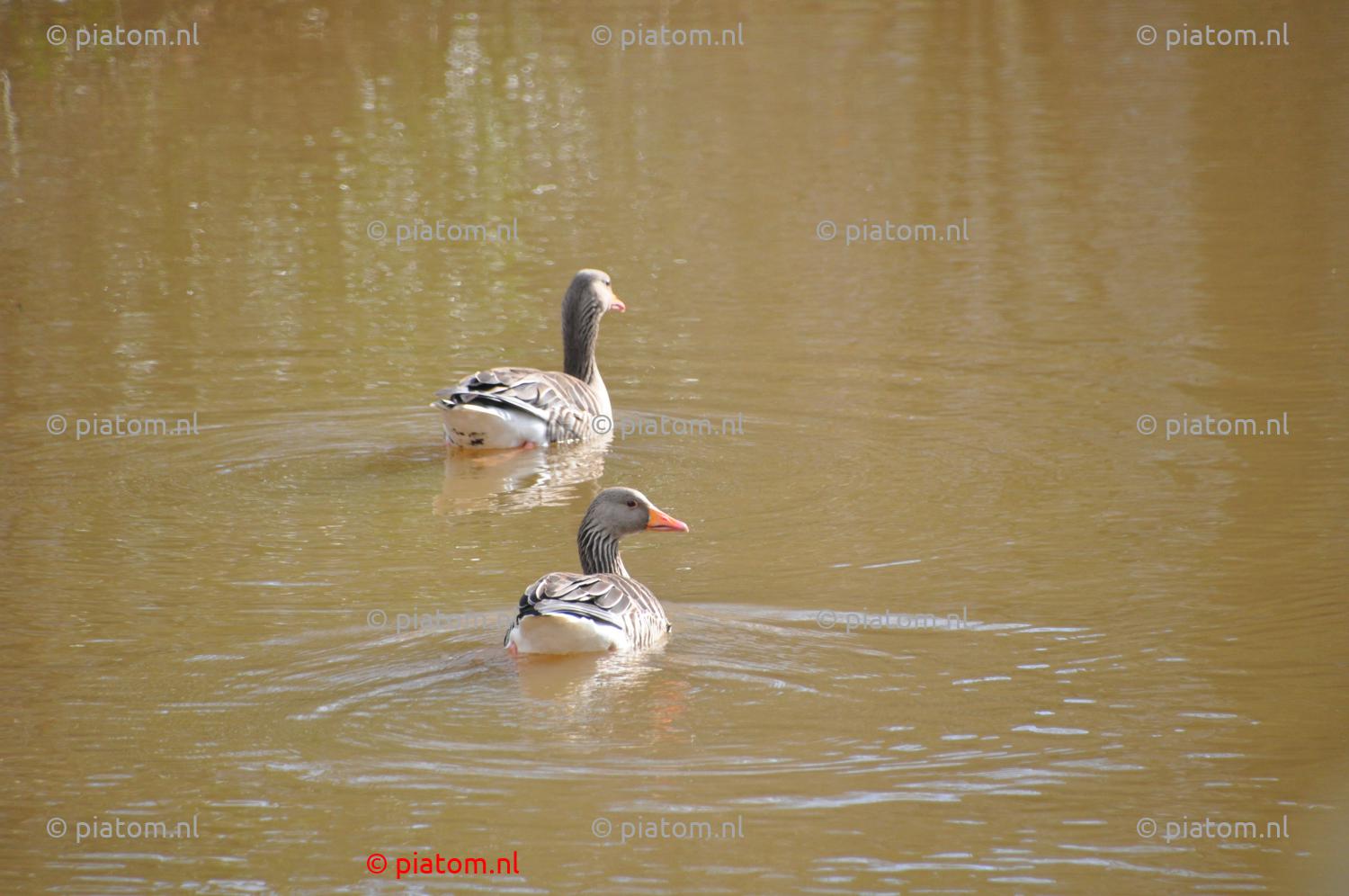 En in het water bij de brug zwemmen twee andersoortige ganzen.